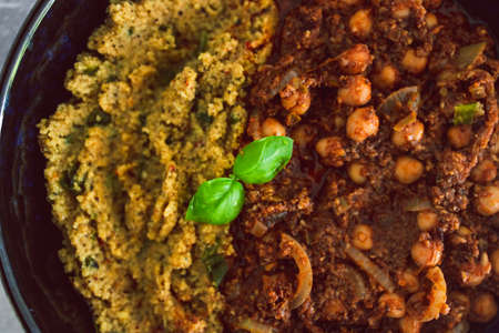 healthy plant-based food recipes concept, vegan moroccan cous cous with chickpea onion and mushroom stew with plenty of spices and herbs