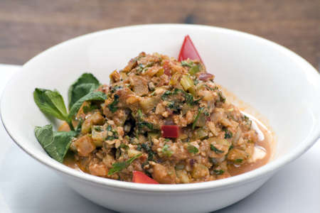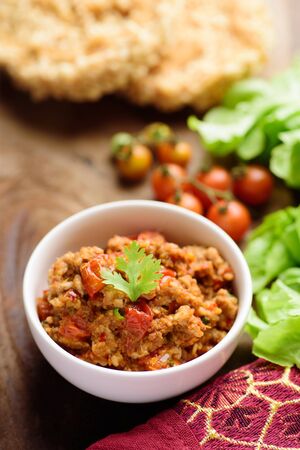 Northern Thai food (Nam Prik Ong), spicy chili minced pork with tomatoes in a bowl on wooden table eating with vegetables, Thai chili paste