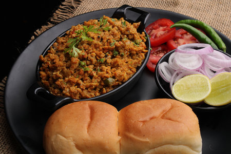 Mutton Kheema Pav OR Indian Spicy Minced Meat served with bread OR kulcha, garnished with green peas. Moody background. Selective focus