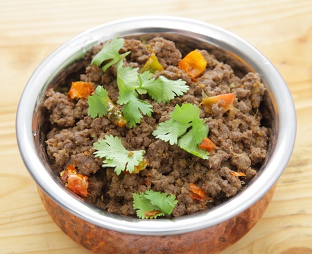 A minced beef or keema curry in a serving bowl, garnished with coriander leaves