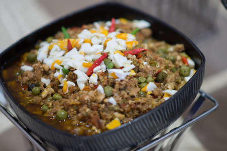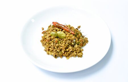 Tasty Khua Kling southern Thai variety of dry curry combines spicy curry paste and ground pork close up in the plate on the table. Horizontal