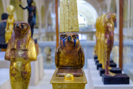 Cairo / Egypt - May 25th 2019: Gilded statuette of Gemehsu (Falcon) of King Tutankhamun, Museum of Egyptian Antiquities (Egyptian Museum)