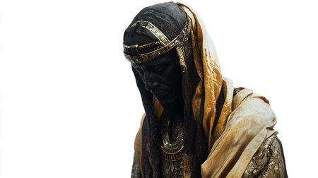 Egyptian statue on a white background with copy space for text.