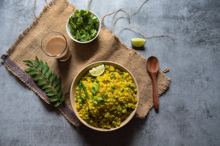 Close up of a bowl of poha along with a glass of tea, a typical Indian breakfast with use of selective focus.