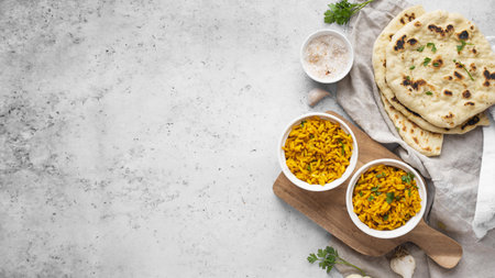 A balti dish with lemon rice, rice flavored with mustard seeds, curry leaves and green chili in a white bowl. Top view with copy space.