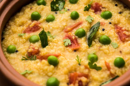 Vegetable Dalia or Daliya Khichadi or Broken Wheat Khichdi with tomato, green peas and chilli, served in a bowl or plate