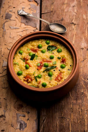Broken wheat or Daliya Upma, served in a plate. selective focus