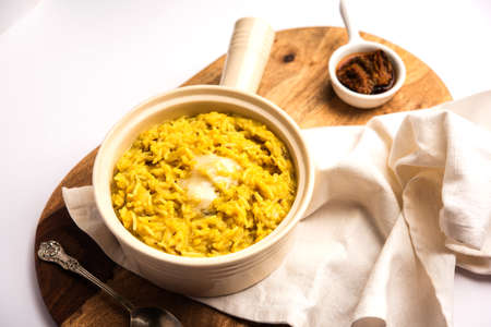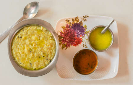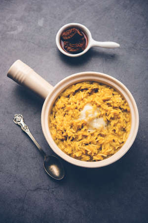 Dal Khichdi Fry With Ghee served in a bowl. Tasty Indian one pot meal. selective focus