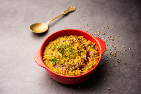 Indian special homemade healthy Methi Khichidi kept ready in a bowl with spoon