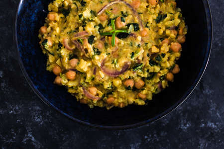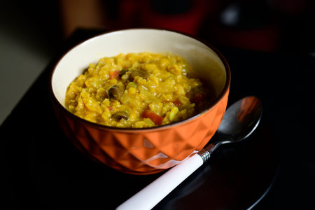 Khichdi or Khichadi, a popular Indian recipe. The food is made of dal or lentils and rice combined with Indian spices and tomatoes. Close up. Selective focus.