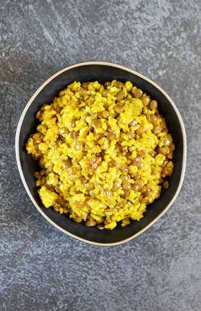Traditional Middle Eastern dish Mujadara: lentils and rice on a dark background