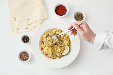 Woman eating tasty chicken curry on light wooden background