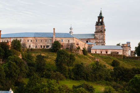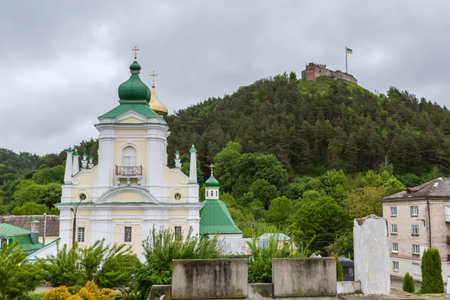 St. Nicholas Cathedral of the former Franciscan abbey of the 17th-18th centuries against the ancient castle on Bona Hill in Kremenets at spring overcast rainy day, Ukraine