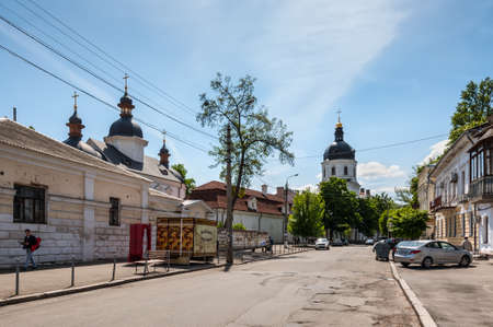 Kyiv, Ukraine - May 10, 2015: Grigory Skovoroda Street and Church of the Annunciation of the Mother of God at the Kyiv-Mohyla Academy at historic district called Podil (Podol), Kyiv downtown.