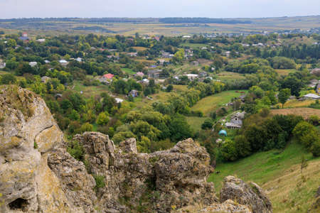 Wild rocky and mountainous nature of Eastern Europe. Landscape background with copy space for text. Selective focus, toned. Corjeuti village, welcome to Moldova.