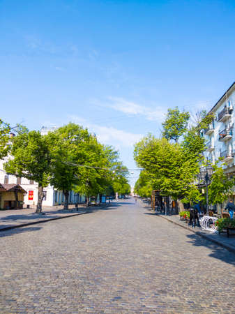 Odessa, Ukraine - April, 30, 2020. Beautiful and empty Derybasivska Street in Odessa, Ukraine. Empty streets during COVID-19 lockdown.