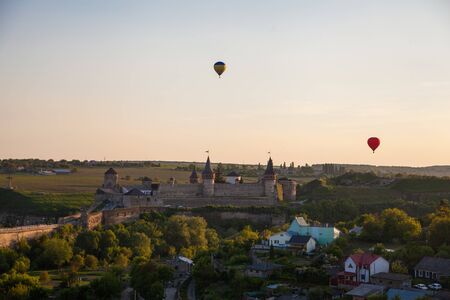Hot air balloon flying in sky over Kamyanets-Podilsky castle