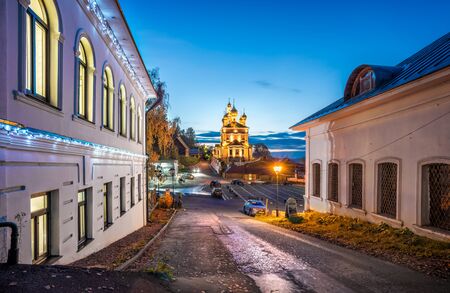Night view of the Resurrection Church in Plyos and buildings with lighted windows