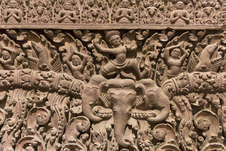 Old stone Lintel of Lord Indra riding on Airavata Elephent in museum in Thailand.