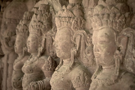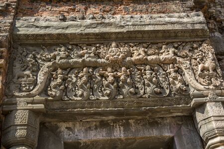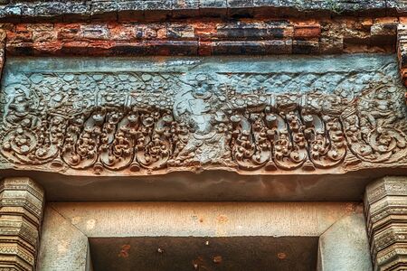 Bas reliefs ruin carving temple ancient city of complex Angkor Cambodia.