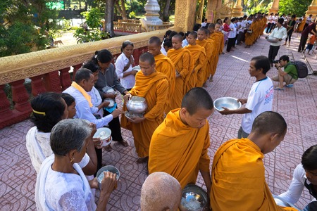 An Giang, Vietnam - Dec 6, 2016: Buddhist monk in south of Vietnam stand in a row waiting people put rice and food offerings in their alms bowl in Chau Doc district