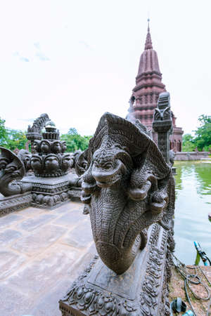 a Naga stone carving at the river Steung Sen in the city of Kampong Thom of Cambodia. Cambodia, Kampong Thom, November, 2017,
