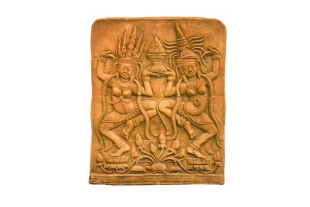 Sandstone carvings two woman dancing in old castle ,Thailand