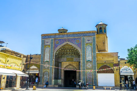 Shiraz, Iran - 29 October, 2018: Wonderful details of Persian exterior of the Shah Cheragh Mosque and Mausoleum. Walls decorated with colorful mosaic. Gorgeous chandeliers. Islamic architecture.