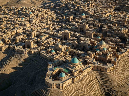 Aerial view of an ancient desert city with blue domes and sandy architecture