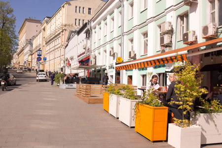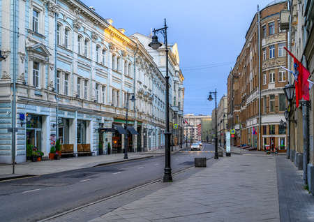 Street in center of Moscow in Russia. Cozy cityscape in Moscow. Architecture and landmarks of Moscow.