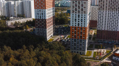 Mytishchi, Russia - August 10, 2019: Panoramic view of residential complex Yaroslavsky in Mytishchi, Moscow region, Russia. Top view of modern building in Moscow region.