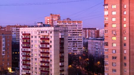 violet morning twilight over residential district in Moscow city at autumn dawn