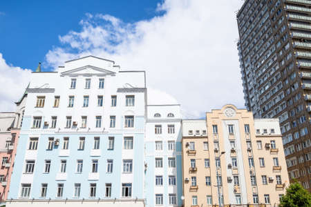 colored facades of apartment houses on New Arbat Avenue in Moscow city on sunny summer day