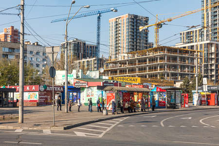 Kyiv, Ukraine - Apr. 04, 2020: Quarantine in the city of Kyiv due to the COVID-19 virus. People are standing at public transport stops