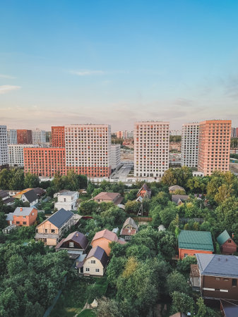urban modern landscape: multi-colored new buildings residential buildings, private low-rise buildings, gardens on a warm summer evening, vertical photo.