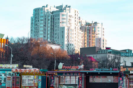 Ufa, Russia, st. Lenina, March 29, 2022. Modern urban buidings in ordinary day. editorial