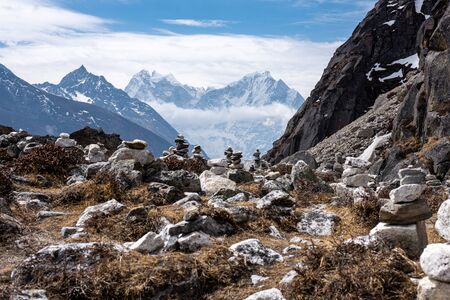 Traditional towers of stones near Gokyo lakes in Nepal Himalayas with snow covered peaks in background