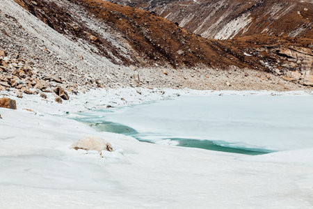 Amazing blue Gokio lake under ice and snow, Nepal