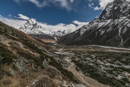 Beautifull Khumbu valley mountains landscape at the Everest Base Camp trek in the Himalaya, Nepal. Himalaya landscape and mountain views.