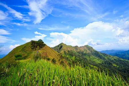 The scenic view of Thai highlands in the sunlight and bright sky.