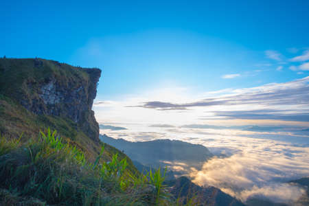 Beautiful sunrise scene at high mountain with yellow clouds and blue sky, Phu chi fah Chiangrai Thailand