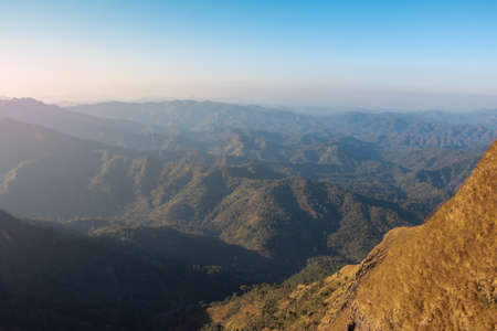 Tranquil landscape on trekking route on top of hazzy tropical rainforest mountain hill with foreground of orange flowering grass at sunset of winter season in Thailand.