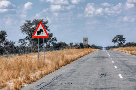 Elephants crossing road warning sign, Namibia highway on Caprivi Strip