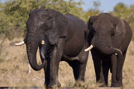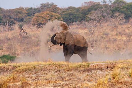 wild elephant throwing sand with its trunk on itself after a swim near the Okavango Delta in Africa