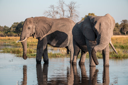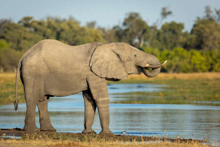 Adult elephant drinking water in golden afternoon light in Okavango Delta in Botswana