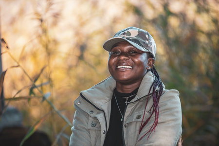 Happy African woman with a cap outside in the beautiful Swedish autumn