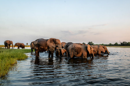 Close encounter with Elephants crossing the Chobe river between Namibia and Botswana in the late afternoon seen from a boat.