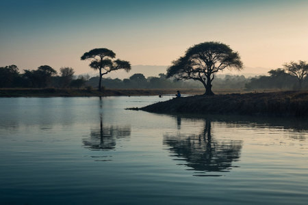 A tranquil riverbank scene at sunset, showcasing misty air, silhouetted trees, and reflective water. This serene landscape embodies natural beauty and peace in nature.