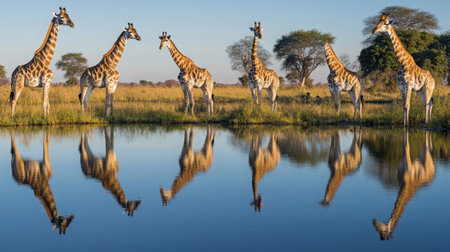 Giraffe at Watering Hole - Multiple giraffes gathered at a serene pond, reflections crisp in the calm water, golden hour glow, peaceful wildlife scene