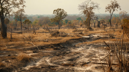 Faded, brown vegetation in a once-lush forest, highlighting the devastation of drought on ecosystems